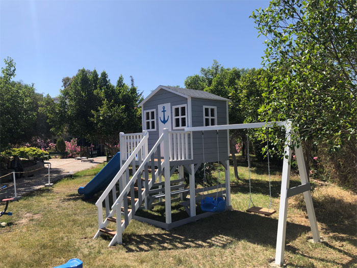 Salıncak: Ahşap çocuk oyun evlerine genellikle bir veya birden fazla salıncak takılır. Bu, çocukların dışarıda eğlenirken hareket etmelerine ve enerjilerini atmasına olanak tanır.